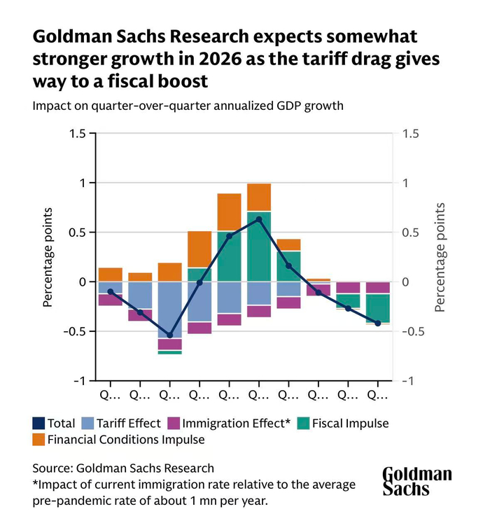 近日,高盛发布美国2026年经济展望。其中提到,随着关税拖累逐渐消退,财政刺激措施将提振经济,美国经济今年表现有望强于许多经济学家的预期。高盛预计,2026年美国 GDP 预计(第四季度,同比)将增长2.5%,高于经济学家普遍预期为2.1%。全年来看,预计经济增长率为2.8%,未来12个月出现经济衰退的概率已从30%降至20%。