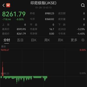 1月28日,印尼股指大幅跳水,印尼综合指数暴跌8%,一度触发暂停交易30分钟。其中,印尼国有银行、与大型企业集团有关联的公司的权重股都遭遇巨大的抛售压力。