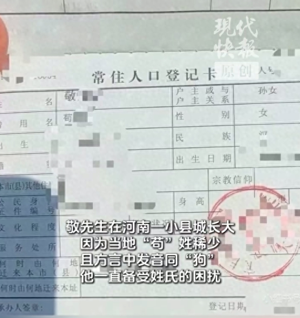 “那段时间,我把软件删了,几晚都睡不好,想怎么改名,后来听说陕西老家那边能改,也有很多人改成功。”敬先生告诉记者,等妻子出了月子,他就开始准备材料。他查询到了很多“苟”姓改“敬”姓的案例,写了申请书,回陕西老家派出所盖章,等材料齐备了,再逐级提交到镇、县、市、省各级公安部门,最后才审批成功,前后历时大约3个月。等改好了,小女儿都过一岁生日了。随后,他又陆续修改了电话卡、银行卡、结婚证等多种身份信息材料。