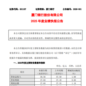 1月28日金融一线消息,厦门银行发布2025年度业绩快报公告。公告显示,2025年度,实现营业总收入58.56亿元,同比增长1.69%;净利润27.5亿元,同比增长1.64%;归属于上市公司股东的净利润26.34亿元,同比增长1.52%;基本每股收益0.90元,同比增长1.12%;不良贷款率0.77%,比上年末上升0.03个百分点。