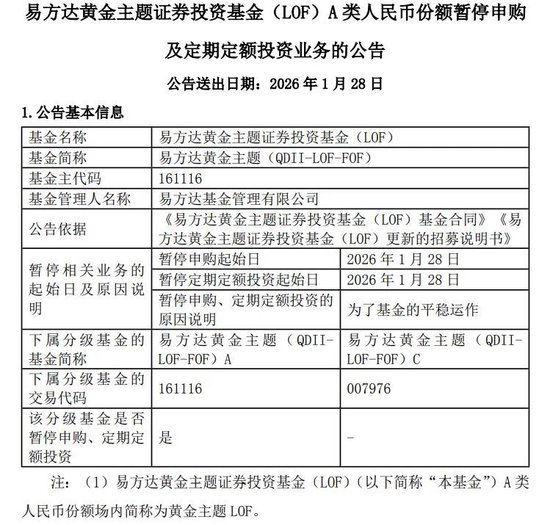 市场过热也触发公募风控。易方达黄金主题LOF宣布自1月28日起暂停相关产品申购,为市场降温。