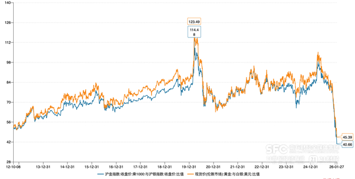 截至1月27日,国际市场上,伦敦金和伦敦银比值回落至46.39,较上日下跌2.3%;国内市场表现更为剧烈,沪金和沪银比值为40.66,较上日下跌3.4%。1月28日下午3点的日盘收盘后,国内金银比进一步收窄至40.38。