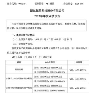 1月28日晚,*ST铖昌(001270.SZ)公告称,*ST铖昌预计2025年归属于上市公司股东的净利润为9500万元~12400万元,上年同期为亏损3111.79万元,同比扭亏为盈。公司股票因2024年度经审计净利润为负值且扣除后营业收入低于3亿元,自2025年4月24日起被实施退市风险警示。若公司2025年度出现《深圳证券交易所股票上市规则》第9.3.12条规定的相关情形,公司股票将面临被终止上市的风险。公司已披露股票可能被终止上市的风险提示公告,并计划更换会计师事务所以推进2025年度审计工作。