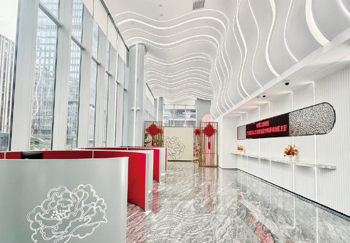 支行分为上下两层,功能分区明确且各具特色。一层为智能服务区,配备最新智能柜员机、自助外币兑换机等设备,满足客户多样化的自助业务需求;且设有贵金属产品展示区、数字人民币应用场景展示区等新金融场景,让客户提前感受未来金融的魅力。二层除了设有传统柜台服务区,近期更是上线了远程在线服务柜口,构建起全渠道线上预约、智慧化自助办理、专业化远程服务、集成化设备运行的运营新模式;数字化产品体验区让客户可以直观了解和使用工行的最新线上金融产品;舒适的企业洽谈区为银企深度交流、举办小型沙龙和路演提供了理想空间。