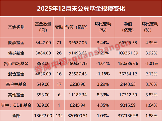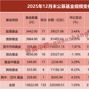 分基金类型来看,2025年12月份,股基、债基以及货币基金规模和QDII基金均有不同程度的增长。