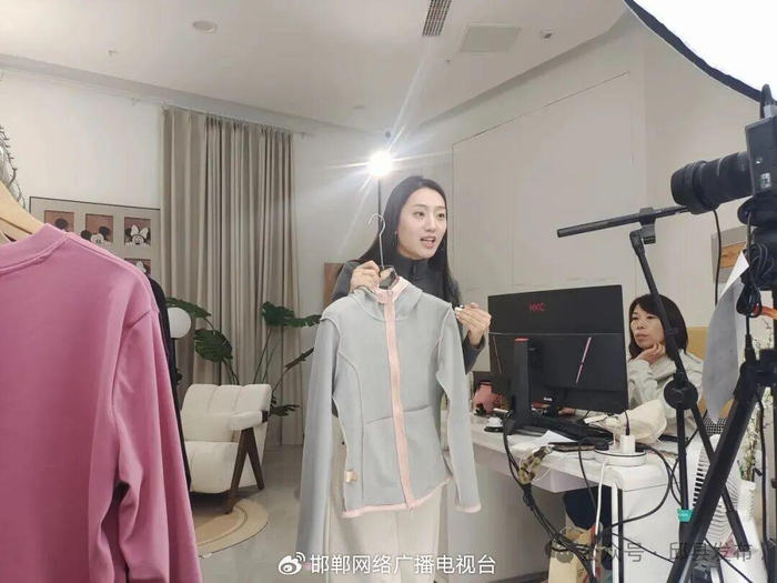 1月27日,邱县电商小镇直播间内,带货主播正在介绍商品。 邱县县委宣传部 提供