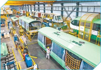 安徽芜湖经济技术开发区,工人进行无人驾驶轨道列车生产作业。