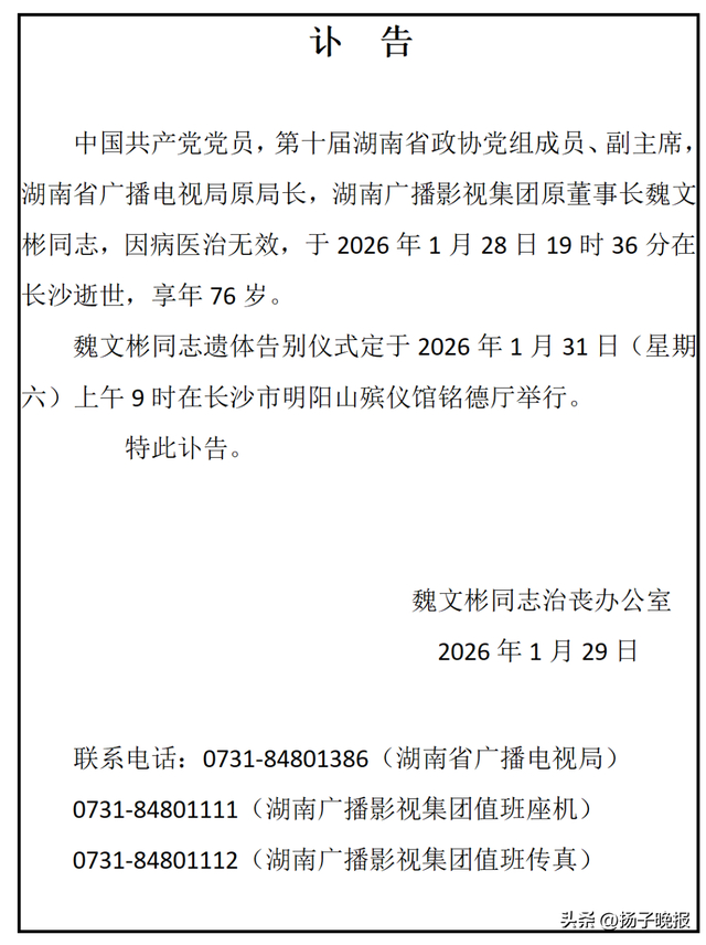 据湖南省广播电视局消息,中国共产党党员,第十届湖南省政协党组成员、副主席,湖南省广播电视局原局长,湖南广播影视集团原董事长魏文彬同志,因病医治无效,于2026年1月28日19时36分在长沙逝世,享年76岁。