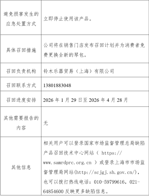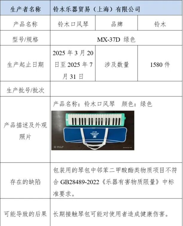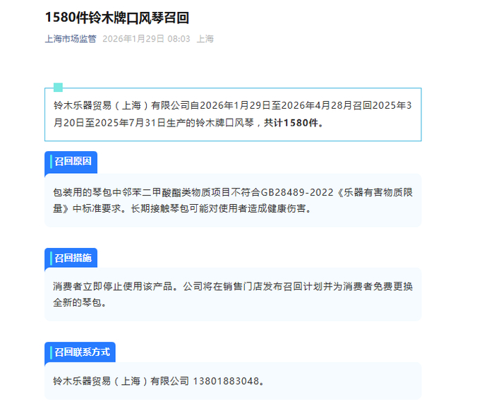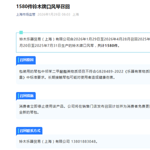 铃木乐器贸易(上海)有限公司自2026年1月29日至2026年4月28月召回2025年3月20日至2025年7月31日生产的铃木牌口风琴,共计1580件。