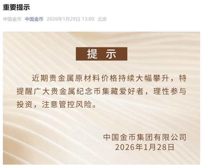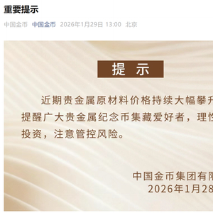 中国金币集团提示风险 每日经济新闻 每日经济新闻官方账号 01.2916:15 关注 每经AI快讯,1月29日,中国金币集团发布公告,近期贵金属原材料价格持续大幅攀升,特提醒广大贵金属纪念币集藏爱好者,理性参与投资,注意管控风险。