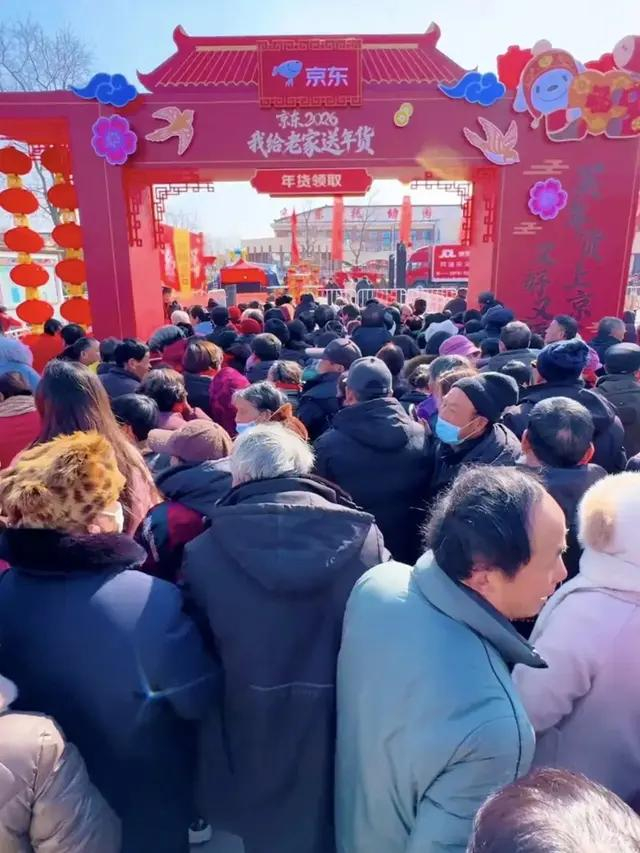 1月29日,江苏宿迁光明村一年一度的免费年货节又来了。京东物流车队满载超万件年货,早就送到了村里。