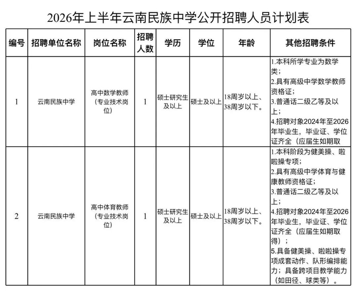 2026年上半年云南民族中学面向社会公开招聘人员2名。