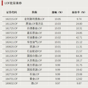 近日,LOF市场关注度较高,原油LOF易方达、嘉实原油LOF、石油基金LOF、华宝油气LOF、资源LOF、国投白银LOF、大宗商品LOF等今日出现批量涨停。这些LOF已经连续两个交易日涨停,溢价率持续攀升。