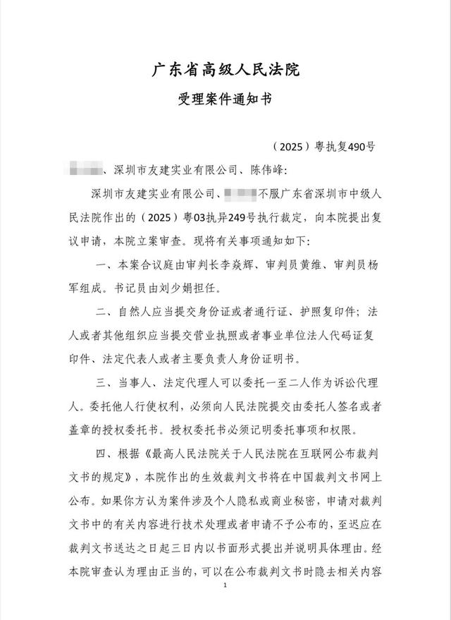 2025年7月,友建公司及陈伟峰向广东省高院申请复议。次月,广东省高院作出《受理案件通知书》,对该案进行立案审查。《受理案件通知书》还显示,该院已确定合议庭组成人员。陈伟峰称,省高院立案后,目前尚无进展。