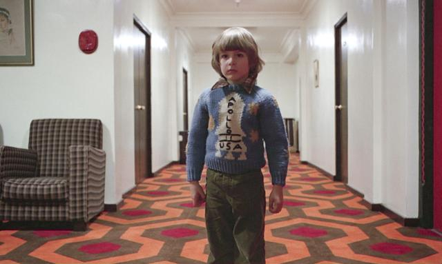 当然,除了历史的角度,《第237号房间》中也不乏一些天马行空的阴谋论。比如,库布里克借《闪灵》暗示自己参与了一项不能宣之于口的政府秘密计划——伪造登月的影像制作,包括他将史蒂芬·金原作里的217号房间改为237号、丹尼身穿的阿波罗11号图案的毛衣、钥匙门牌上大写字母组成的“MOON”与飞船发射场类似的六边形地毯图案等,都是库布里克刻意隐藏其中、有待观众破解的线索。