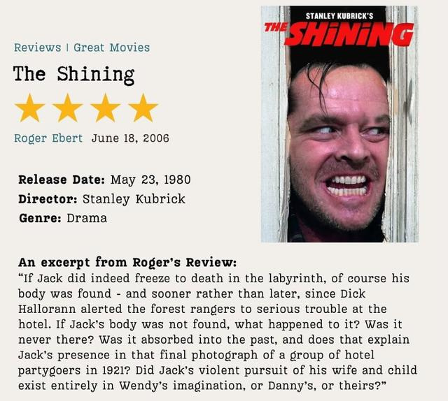 时间回溯到1980年5月23日,《闪灵》开始在北美各大影院隆重上映。影片改编自畅销小说作家史蒂芬·金的同名作品,由杰克·尼克尔森、谢莉·杜瓦尔、丹尼·劳埃德主演,讲述失意作家杰克与妻子温蒂、儿子丹尼在风雪肆虐的凛冬,被困于与世隔绝的酒店内,莫名幻视过去曾在酒店里出现的人物及场景(所谓“闪灵”),由此导致了一系列致命遭遇。