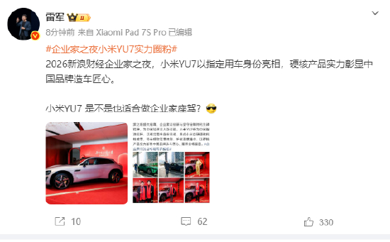 1月30日,小米创办人雷军在微博发文:#企业家之夜小米YU7实力圈粉#。2026新浪财经企业家之夜,小米YU7以指定用车身份亮相,硬核产品实力彰显中国品牌造车匠心。小米YU7 是不是也适合做企业家座驾?