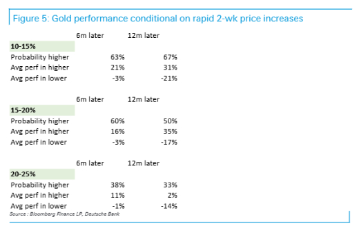德银认为随着黄金两周涨幅的加速,金价进一步上涨的概率呈现下降趋势。