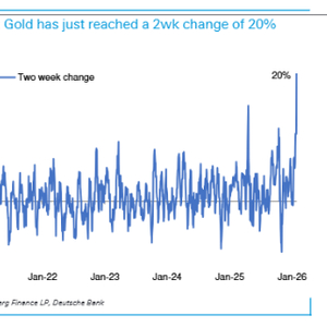 德意志银行分析师Michael Hsueh指出,当黄金两周涨幅越过20%的门槛,金价未来六个月内继续上涨的概率骤降至38%。平均涨幅只有11%。而下跌的概率达到62%,平均跌幅为1%。德银对2026年第四季度的平均金价预测仍维持在6000美元。
