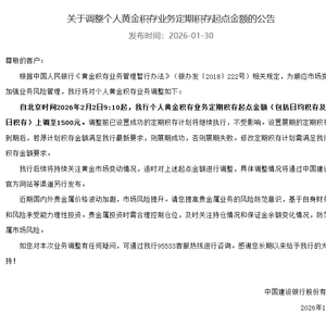 自北京时间2026年2月2日9:10起,我行个人黄金积存业务定期积存起点金额(包括日均积存及自选日积存)上调至1500元。调整前已设置成功的定期积存计划将继续执行,不受影响。设置展期的定期积存计划到期后,若原计划积存金额满足我行最新要求,则展期成功,否则展期失败。修改定期积存计划需满足我行最新积存金额要求。