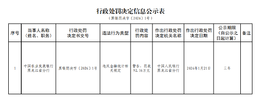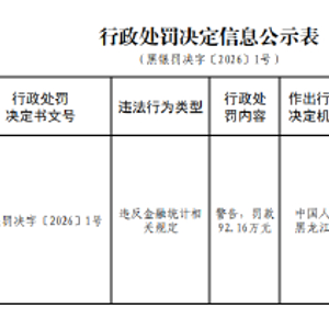 农发行黑龙江省分行被罚92.16万元:违反金融统计相关规定 金融一线 01.3015:29 关注 1月30日金融一线消息,据中国人民银行黑龙江省分行行政处罚决定信息公示表显示,中国农业发展银行黑龙江省分行因违反金融统计相关规定,被警告,罚款92.16万元。