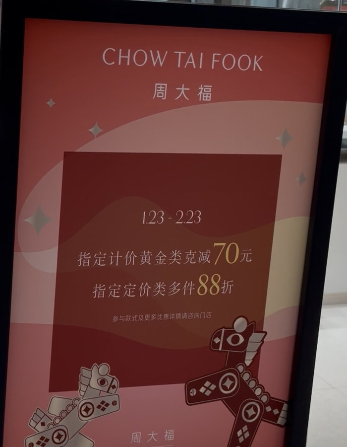 周大福某门店推出黄金类克减70元活动,定价类产品多件享88折。