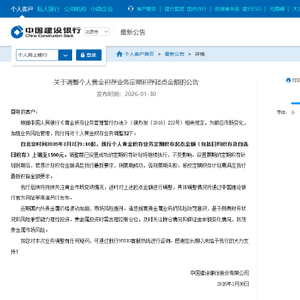 1月30日,建设银行发布《关于调整个人黄金积存业务定期积存起点金额的公告》,自北京时间2026年2月2日9:10起,个人黄金积存业务定期积存起点金额(包括日均积存及自选日积存)上调至1500元。调整前已设置成功的定期积存计划将继续执行,不受影响。设置展期的定期积存计划到期后,若原计划积存金额满足我行最新要求,则展期成功,否则展期失败。修改定期积存计划需满足我行最新积存金额要求。
