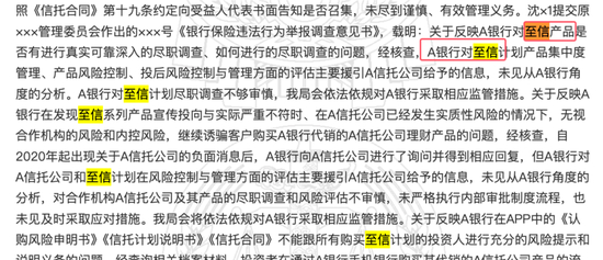 6 、判决书显示,沈×1曾经向监管部门反应情况,监管部门给了确定性回复,“沈×1提交原×××管理委员会作出的×××号《银行保险违法行为举报调查意见书》,载明:关于反映A银行对至信产品是否有进行真实可靠深入的尽职调查、如何进行的尽职调查的问题,经核查,A银行对至信计划产品集中度管理、产品风险控制、投后风险控制与管理方面的评估主要援引A信托公司给予的信息,未见从A银行角度的分析。A银行对至信计划尽职调查不够审慎,我局会依法依规对A银行采取相应监管措施。”