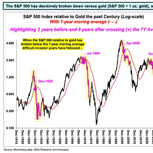 Stifel表示,这波上涨行情打破了股票与黄金之间长期存在的联系,并指出标普500指数相对于黄金的价格已经跌破了其七年移动平均线。