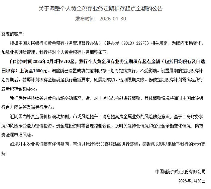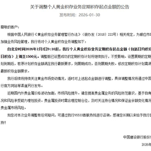 1月30日下午,建设银行发布消息,将上调个人黄金积存业务定期积存起点金额至1500元。