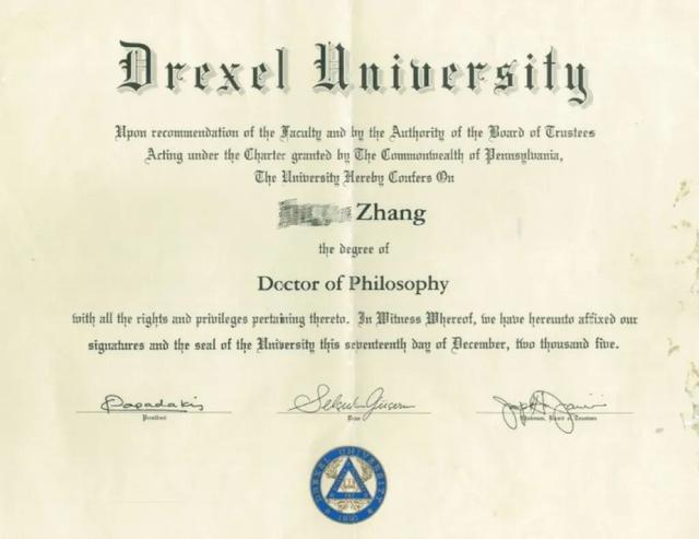 张先生的博士学位证书。
