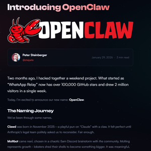2026年1月27日,因AI巨头Anthropic指控“Clawdbot”与其旗下的“Claude”商标相似,Peter被迫将项目更名为Moltbot。1月29日,Peter又将名字改为OpenClaw,Open意为开源、对所有人开放、社区驱动;Claw则代表了要不忘项目的初心和来路。