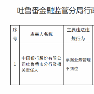 中国银行吐鲁番市分行被罚20万元:票据业务管理不到位 金融一线 01.3020:22 关注 1月30日金融一线消息,据吐鲁番金融监管分局行政处罚信息公示列表显示,中国银行股份有限公司吐鲁番市分行因票据业务管理不到位,被罚款20万元。同时,相关责任人王腾被警告。