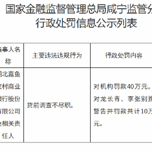 湖北嘉鱼农村商业银行被罚40万元:贷前调查不尽职