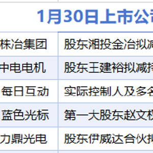 据统计,1月30日,盘后株冶集团、中电电机、每日互动、蓝色光标、力鼎光电等5家上市公司披露拟减持情况。当日暂无A股公司披露增持情况。