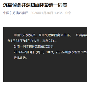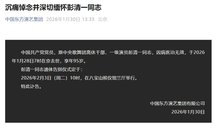 据“中国东方演艺集团”公众号,中国共产党党员,原中央歌舞团离休干部、一级演员彭清一同志,因病医治无效,于2026年1月28日7时在京去世,享年95岁。