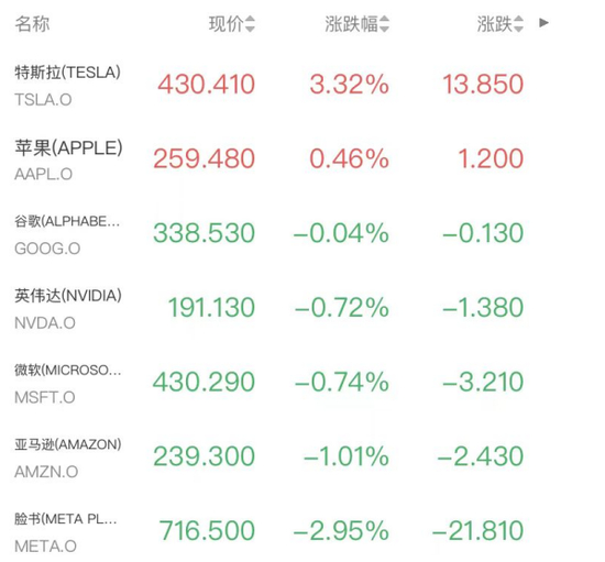 明星科技股跌多涨少,特斯拉涨3.32%,谷歌跌0.04%,英伟达跌0.72%,微软跌0.74%,亚马逊跌1.01%,甲骨文跌2.62%,Meta跌2.95%。