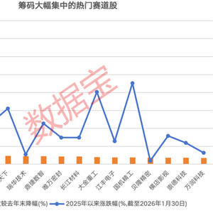 据证券时报·数据宝统计,以国防军工、基础化工、电力设备等为主的热门主线股中,截至2026年1月30日,最新股东户数较去年末(2025年12月31日)下降幅度不低于5%的个股有116只。