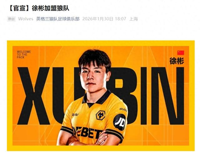 北京时间1月30日,英格兰狼队足球俱乐部官方宣布,中国球员徐彬正式加盟球队。