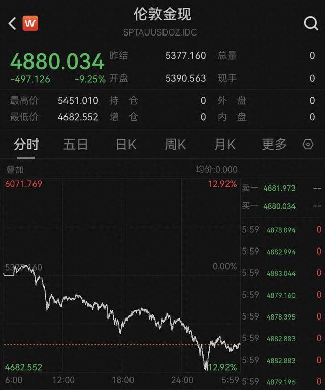昨夜今晨,贵金属市场大跳水,现货黄金盘中最高跌超12%,最低跌破4700美元/盎司,最终报收4880.034美元/盎司,日跌9.25%。
