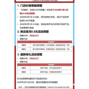 有消息称,库迪咖啡发布门店价格策略和活动调整通知。通知指出,“全场9.9元不限量”活动将于2026年1月31日24时正式结束,2026年2月1日0时起,将开启特价专区,部分产品仍然延续9.9元不限量。2026年2月1日0时起,库迪自有平台内非特价活动产品,均按零售价售卖。库迪咖啡方面回应称,属实。库迪确实要缩小9.9元活动的覆盖范围。