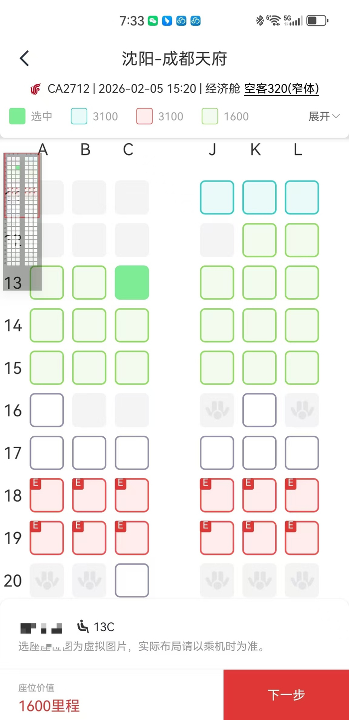 返程航班同样存在锁座问题。记者购买的国航沈阳至成都的直达航班,显示前19排蓝绿红色的座位需要里程兑换,自主选座仅能覆盖20排及之后的部分区域。