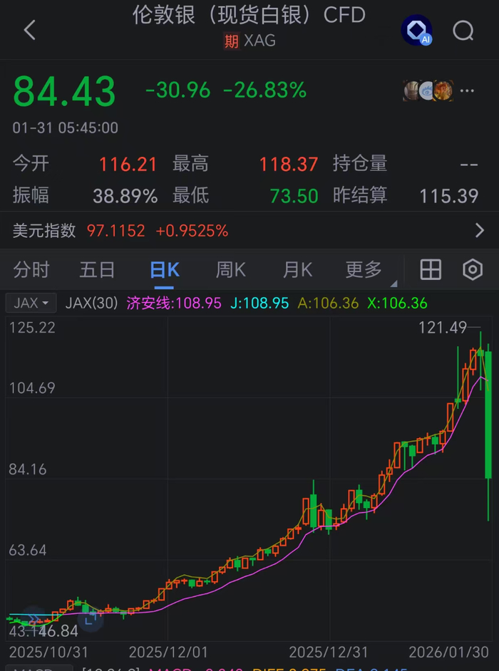 21世纪经济报道记者注意到,1月30日晚间,国际黄金、白银又迎“巨震一夜”,国际金价跌落回4900美元/盎司下方,现货黄金跌幅超9%;国际银价跌落回90美元/盎司下方,现货白银跌幅超26%。
