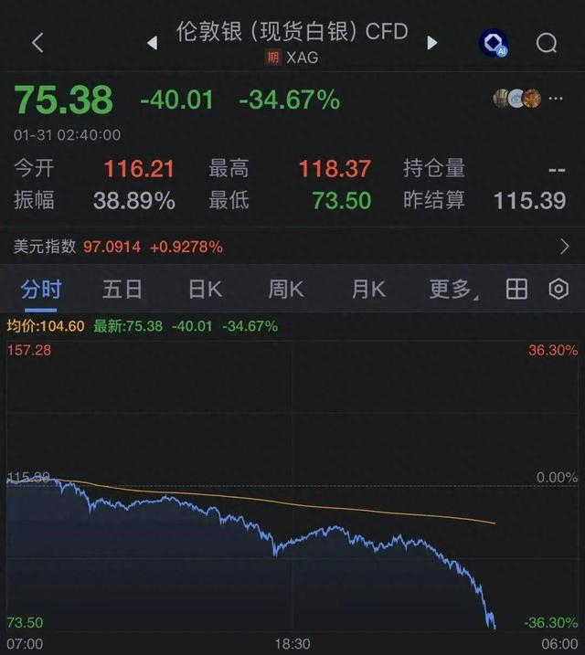 1月31日凌晨2点40左右,现货白银日内跌幅扩大至34.67%,从110美元/盎司上方一路跌至75.38美元/盎司。现货黄金日内跌幅扩大至12.41%,从5400美元/盎司跌至4709.68美元/盎司。