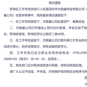 罗湖区工作专班持续介入处置深圳市杰我睿珠宝有限公司(以下简称杰我睿公司)经营异常事件,现将最新情况通报如下: