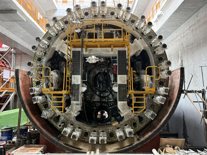 针对复杂的地质与环境条件,项目选用两台开挖直径6.98米的复合式土压平衡盾构机进行施工。为保障盾构安全、精准始发与推进,项目团队深入开展施工风险预控,针对侧穿下穿重要建筑、岩层掘进、管线保护等关键环节,制定了专项施工方案与应急预案。通过优化刀盘配置、掘进参数与注浆工艺,并借助信息化施工管理系统,实现对地表沉降、盾构姿态的实时监测与动态调控,全力保障工程安全与周边环境稳定。