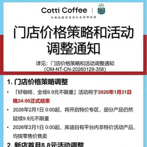近日,有网友在社交平台晒图称,库迪咖啡发布了《门店价格策略和活动调整通知》,通知显示:门店的「好咖啡,全场9.9元不限量」活动将于2026年1月31日24:00 正式结束。2026年2月1日起,库迪将开启特价专区,部分产品仍然延续9.9元不限量,同时,库迪自有平台内非特价活动产品,均按零售价售卖。