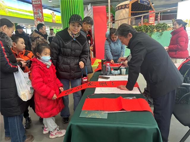 人间烟火气,最抚凡人心。人们在享受美食的同时,也关注着精神追求。应大家要求,内蒙古美术家协会会员、退休教师梁绪现场用隶书写下一副副春联。“这一幅‘春风得意马驰千里,旭日扬辉光照万家’就是我家辞旧迎新的春联了。”市民张先生高兴地说。