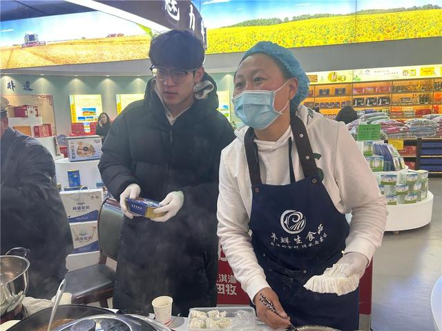 “我们的烧麦用的是锡林郭勒草地羊的羊霖肉,就是羊后腿的腱子肉,有自己独特的味道,冻了以后味道也不会变。”当日上午,内蒙古羊鲜生食品有限公司的销售总监吕静男一边包着烧卖一边介绍,她的周围围满了前来买烧麦的客人。“我们包的烧麦不够卖,羊杂产品也一直在卖,销量不错。年货节给了我们展示自己的机会,也让市民有了更多的选择权。”吕静男说。