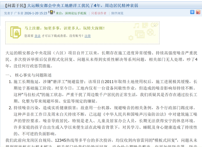 据“深圳论坛”上该网友的投诉内容显示,“颐安都会中央花园(六区)”项目自2011年取得土地使用权后,施工进展缓慢,长期处于基础施工阶段。目前工地内仅有一台设备间歇性作业,但产生的噪音在工作日及周末持续不断,这种“马拉松式”的施工状态,严重影响周边数千户居民正常生活。居民质疑,其是否存在通过拉长工期、化整为零来规避环保、安监等规定的嫌疑。